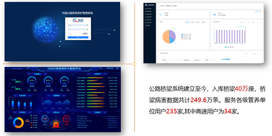 我公司自上世纪90年代承担交通部桥梁管理系统科技项目研究以来,现今已研发包括CBMS公路数字化管理系统、CBMS智能化巡检小程序、城市桥梁管理系统在内的桥梁数字化产品3项,在全国27个省份得到广泛应用,是养护单位高效完成桥梁养护工作必不可少的生产工具,为管理部门的监管工作提供了可视化、智能化抓手,同时为国家桥梁基础数据库的建立和国家公路桥梁数据资源的管理治理应用提供了强有力支撑。